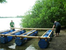 Teambuilding Flossbau Der gemeinsame Bau eines Flosses ist eine der beliebtesten Teamuebungen. Bei diesem Teambuilding stehen insbesondere die Kommunikation und die Kooperation der Teammitglieder im Vordergrund. Als Wasserprogramm hat unser Teambuilding Flossbau zudem seinen ganz eigenen Reiz. Die Teamarbeit beim Flossbau bleibt den Teilnehmern auch aufgrund der Erlebnisse inmitten der schoensten Seenlandschaften Schleswig-Holsteins nachhaltig in Erinnerung. Insgesamt halten wir Material fuer drei bis vier Floesse mit einer maximalen Besatzung von dreissig Teilnehmern vor. Die Flossgroessen koennen wir individuell auf die Anzahl der Teilnehmer ausrichten. Die Flossanzahl stimmen wir mit Ihnen ab. Je nach Trainingsziel entscheiden wir gemeinsam, ob moeglichst viele (alle) Teilnehmer gemeinsam an einem Floss bauen, oder aber ob kleinere Teams jeweils ein eigenes Floss zu Wasser lassen und sich auf dem Wasser bei der Erfuellung durch uns gestellter Aufgaben als Team profilieren muessen. Grundsaetzlich ist unser Flossbau-Programm fuer alle Altersgruppen geeignet. Auch wenn beim Bau des Flosses Ihre Kreativitaet gefragt ist, so geben unsere Trainer jedoch nur die Floesse fuer eine Fahrt frei, die unseren Sicherheitsanspruechen genuegen. Das fertige Floss ist aeusserst stabil und kann auch bei einigen Windstaerken sicher ueber den See gefuehrt werden. Selbstverstaendlich begleiten unsere erfahrenen und fuer Wassersport zertifizierten Trainer die Flossfahrt. Zudem werden die Flossbesatzungen mit Schwimmwesten ausgestattet.