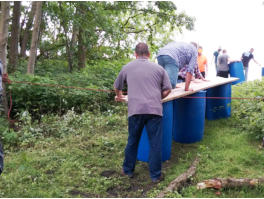 Zur Einstimmung auf die Managementmassnahme bereiten wir einen Fruehstuecksimbiss am Seeufer vor. Der aktive Teil Ihres Teamtrainings beginnt anschliessend mit einem kleinen Teamspiel als ‚Warm-up‘. Danach bauen Sie mit vereinten Kraeften ein Floss. Das Team hat diese Aufgabe eigenstaendig ohne Hilfe durch unsere Trainer zu erfuellen. Den Schwierigkeitsgrad steuern wir je nach Trainingsausrichtung und Teamstruktur durch die Rahmenbedingungen wie Baumaterial, Hilfsmittel und Aufgabenstellung. Nur gemeinsam wird es gelingen, ein seetuechtiges Floss zu bauen. So entscheidet einzig und allein der Teamgeist, ob und wann das Floss in See sticht … Auch wenn die Fahrt auf dem See keine sportliche Hoechstleistung erfordert, ist eine koerperliche Anstrengung vonnoeten. Es gilt: Gemeinsames, abgestimmtes Vorgehen reduziert den Aufwand fuer den Einzelnen. Auf dem See hat das Team eine weitere Aufgabe zu erfuellen. Nach dem Flossbau wechseln wir die Location. Unser ca. 500m entferntes Naturcamp bietet ideale Bedingungen, das Teamtraining ganz individuell nach Ihren Wuenschen fortzusetzen. So koennen wir das Teambuilding mit einem Teamspiel (oder mehreren) ausklingen lassen, um so die positiven Effekte der Flossbaumassnahme zu festigen. Es besteht aber auch die Moeglichkeit, dass sich die Teilnehmer bei zahlreichen Aktivitaeten wie z.B. Bogenschiessen, Axtwerfen, Rodeokissen u.v.m. auf dem Campgelaende treiben lassen und den Spass im Team zwanglos geniessen. Den Abschluss des Teamtrainings bildet ein umfangreiches Buffet inmitten der Natur. Feste Unterstaende und ein Lagerfeuer sorgen fuer eine einmalige Atmosphaere. Anmerkungen: Bauprojekt Die Aktivitaeten im Rahmen eines Bauprojektes sind sehr gut geeignet, Ablaeufe, Beziehungen und Verhaltensweisen sichtbar zu machen, die im betrieblichen Alltag gern verdraengt werden und nicht zwangslaeufig sichtbar sind. Unser Moderator und Trainingsleiter unterbricht phasenweise die Aktivitaeten des Teams, um so seine aktuellen Beobachtungen und die Erfahrungen des Teams auf allgemeine Aspekte der Zusammenarbeit und Kommunikation zu adaptieren. Aktivitaeten Die Aktivitaeten im Rahmen des Trainings richten wir ganz individuell auf Ihre Zielstellung und die Zusammensetzung des Teams aus. Bei der Planung des Trainings achten wir darauf, dass immer auch der Spass fuer die Teilnehmer im Vordergrund steht. Der Effekt des gemeinsamen Erlebens wirkt sich dabei grundsaetzlich positiv auf das Zusammengehoerigkeitsgefuehl und die Motivation im spaeteren betrieblichen Alltag aus. Moderation und Trainingsleitung Die Organisation des Trainings einschliesslich des obligatorischen Vorgespraeches uebernimmt unser Moderator und Trainingsleiter. Unsere erfahrenen Trainer leiten das Bauprojekt und die Teamspiele. Auswertung / Ergebnis Am Ende des Teamtrainings wertet das Team die Teambuildingmassnahme unter Anleitung unseres Moderators aus. Unser Moderator bringt die ueber den Tag gewonnenen Eindruecke in die Feedbackrunde ein.