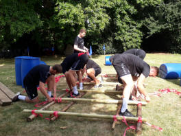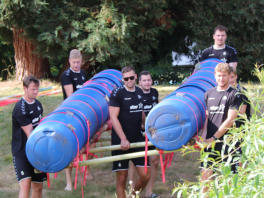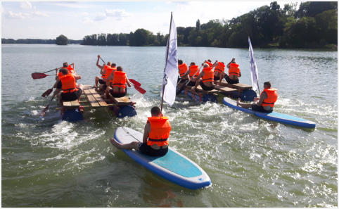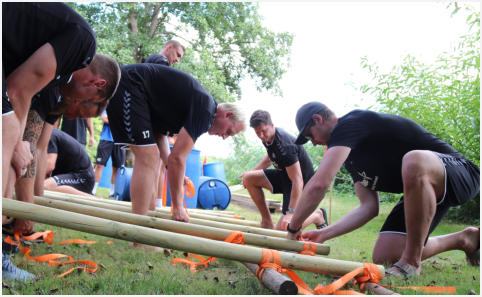 Auf dem Gelaende der Gustav-Heinemann-Bildungsstaette in Bad Malente am Kellersee haben wir fuer den THW Kiel im Rahmen der Saisonvorbereitung 2020 / 21 ein Teambuilding organisiert und durchgefuehrt. Ausgewaehlt haben die THW-Verantwortlichen unser Teambuilding ‚Flossbau‘. Bei allerbestem Sommerwetter startete unser Trainer Andreas Koester das Programm mit einem koordinativen Teamspiel. Gut aufgewaermt ging es danach an die eigentliche Aufgabe, dem Bau zweier Floesse mit anschliessender Wettfahrt ueber den See. Dazu wurden die Teams „Alt“ und „Jung“ gebildet. Als kleine Zusatzaufgabe galt es, den jeweils Teamaeltesten auf einem SUP-Board hinterherzuziehen. Je Team wurde eine THW-Fahne verteilt, die waehrend der gesamten Wettfahrt sichtbar im Fahrtwind zu wehen hatte.Nachdem beide Teams von unserem Trainer Klaus Kluender mit der Knotentechnik vertraut gemacht wurden, startete bereits in der Bauphase ein heisser Fight um die beste Konstruktion. Am Ende hatte das Team „Alt“ u.a mit Steffen Weinhold, Patrick Wiencek, Pavel Horak, Hendrik Pekeler und Domagoj Duvnjak nicht nur beim Flossbau gegen Team „Jung“ u.a. mit Rune Dahmke und Sven Ehrig die Nase vorn. Auch die Wettfahrt mit dem Floss konnte Team ‚Alt‘ fuer sich entscheiden. Beim abschliessenden, von uns exklusiv am Seeufer angerichteten Buffet fand die Mannschaft um die Trainer Filip Jicha und Christian Sprenger sowie Athletiktrainer Hinrich Brockmann inmitten der sehr anstrengenden Saisonvorbereitung ein wenig Entspannung.